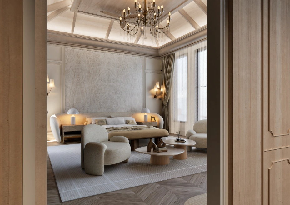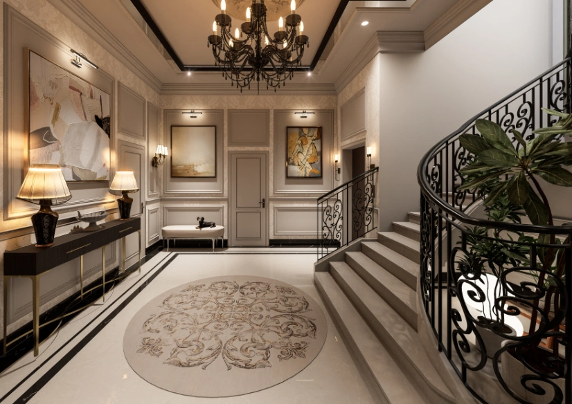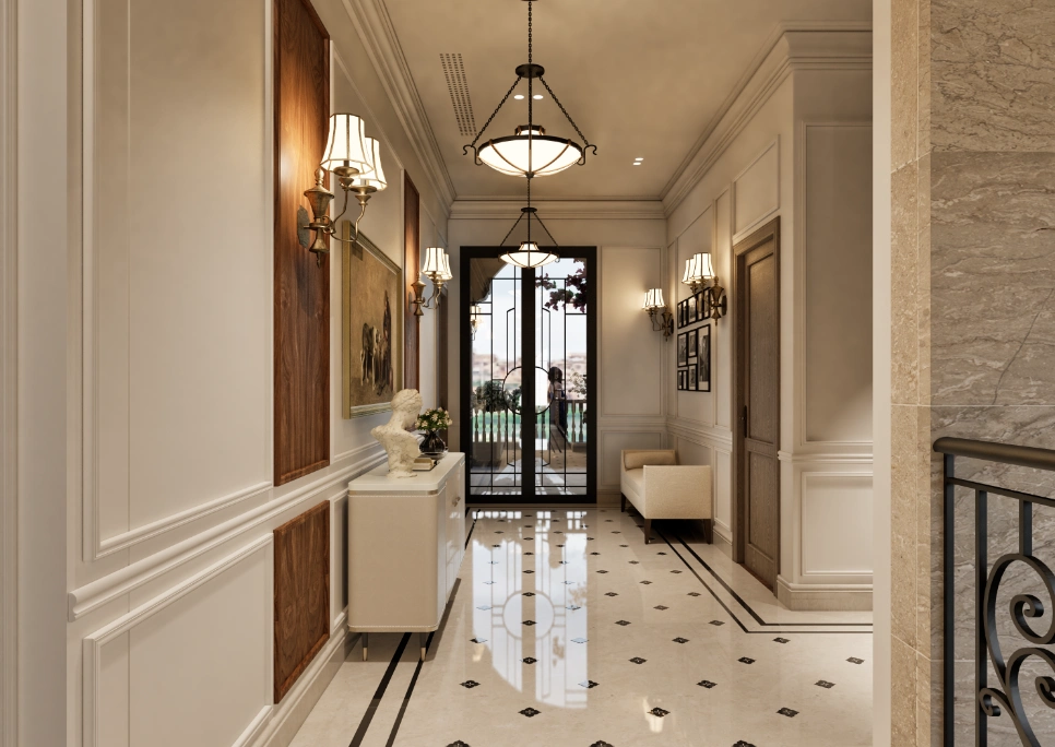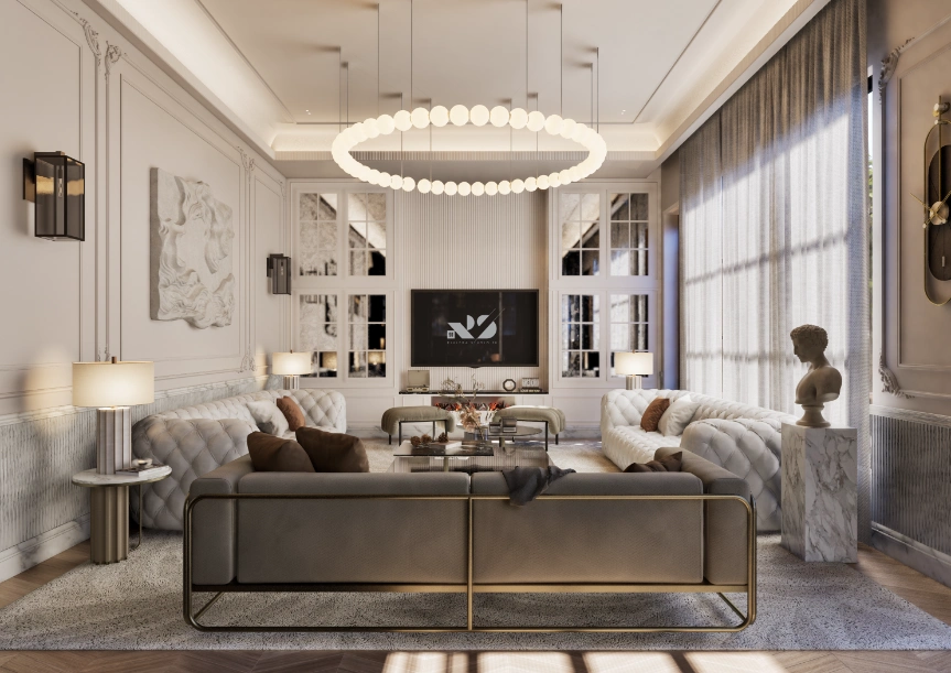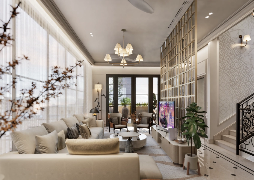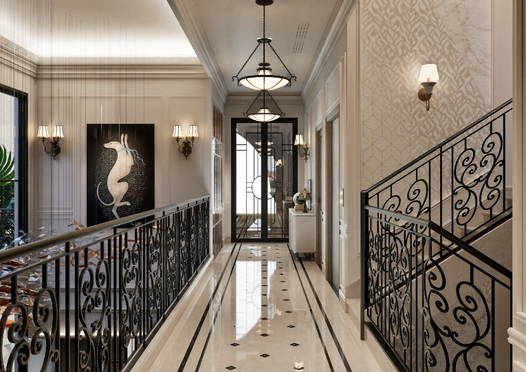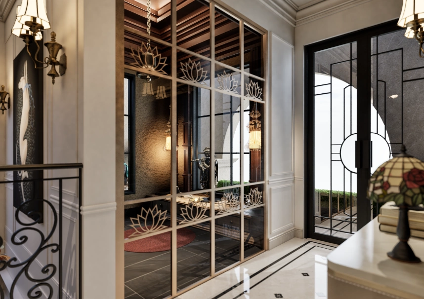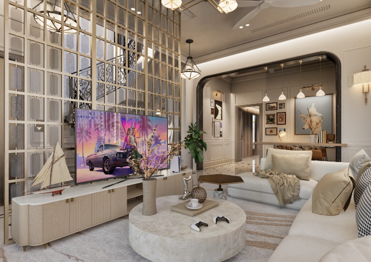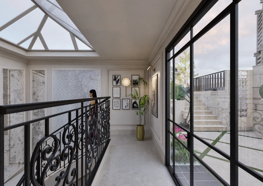 Crafted as a statement of grandeur, Sehgal Residence in Gurgaon is a 16,000 sq. ft. classical villa designed by RS90 Design Studio. The façade draws inspiration from European neoclassical architecture, featuring elegant archways, full-length windows, wrought iron railings, and a stunning marble-finished exterior.