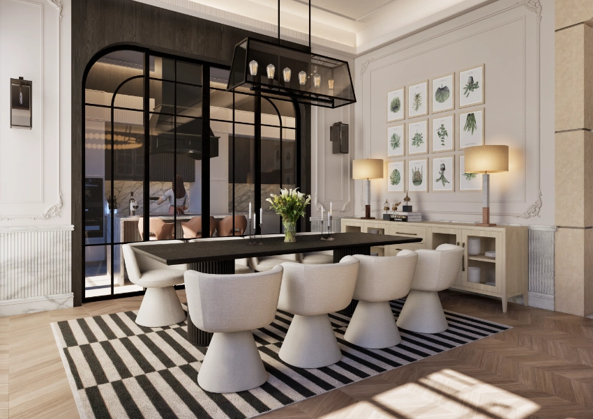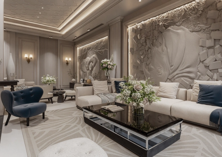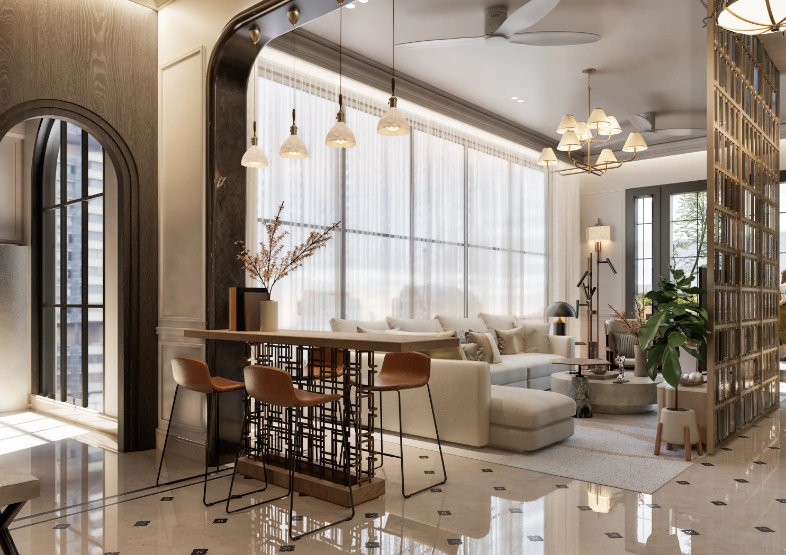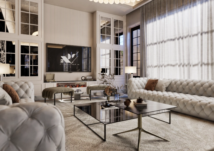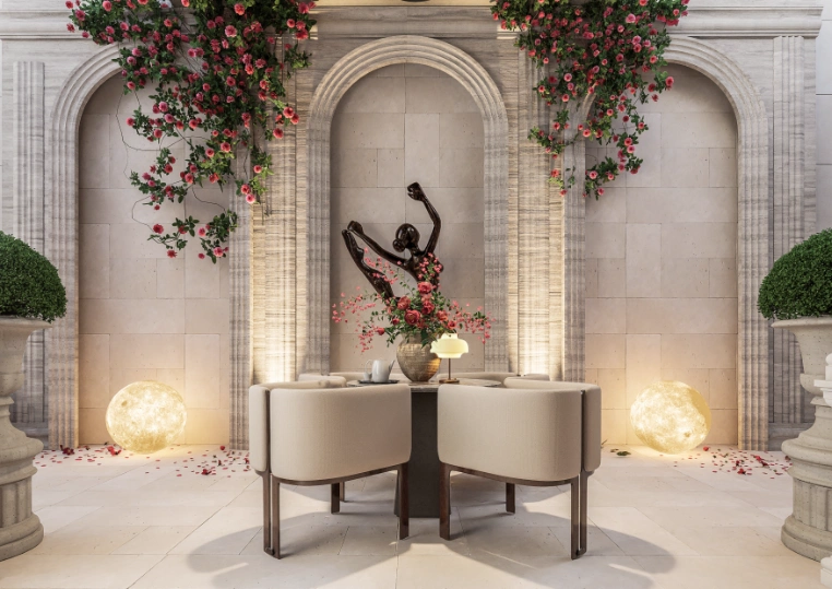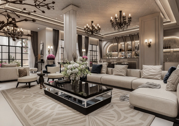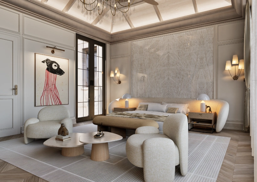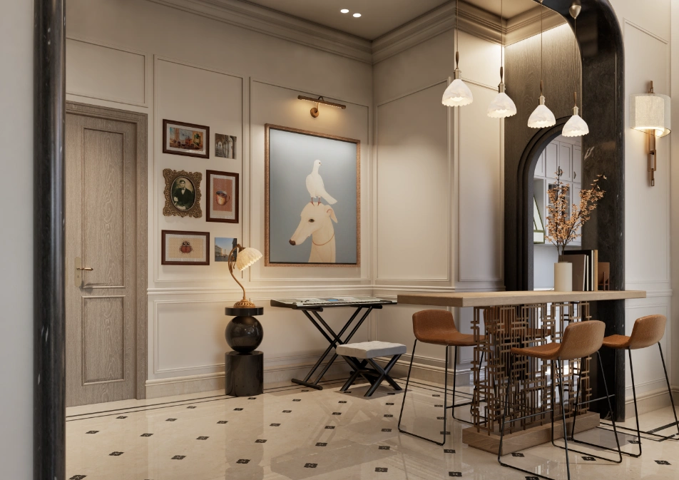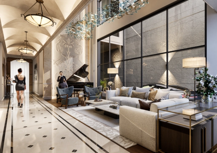 Crafted as a statement of grandeur, Sehgal Residence in Gurgaon is a 16,000 sq. ft. classical villa designed by RS90 Design Studio. The façade draws inspiration from European neoclassical architecture, featuring elegant archways, full-length windows, wrought iron railings, and a stunning marble-finished exterior.